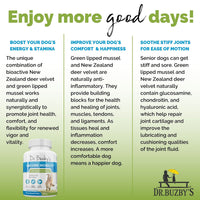 all-natural “super supplements”—Green Lipped Mussel and New Zealand Deer Velvet. It has helped thousands of dogs around the world rediscover their inner puppy.